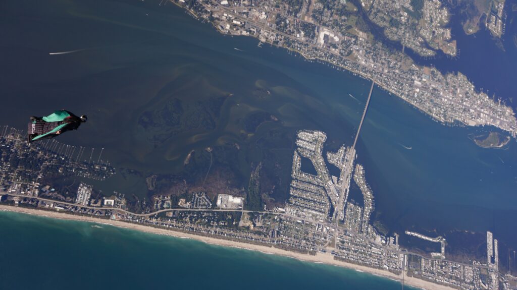 Wing suiting is the ability to fly your body horizontally at greatly enhanced speeds while substantially reducing your vertical fall rate. By using a wingsuit you are able to travel vast distances from your actual exit point and easily double or more your freefall time.